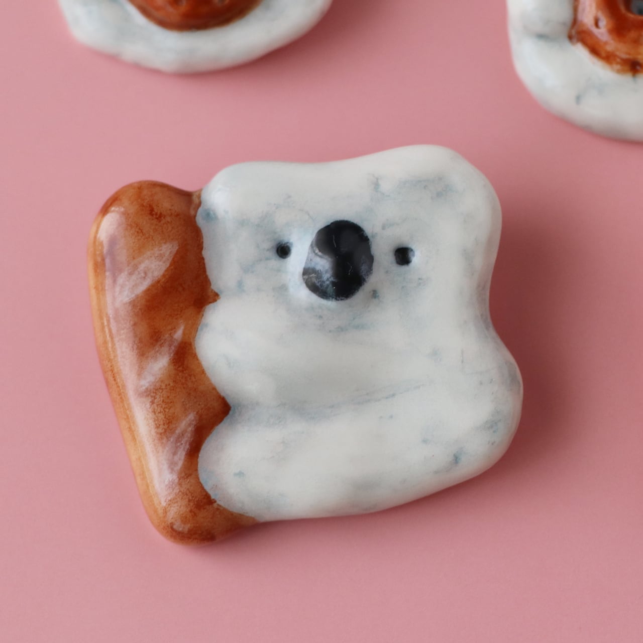 磁土(磁器)で制作したバゲット(フランスパン)とコアラのブローチ。