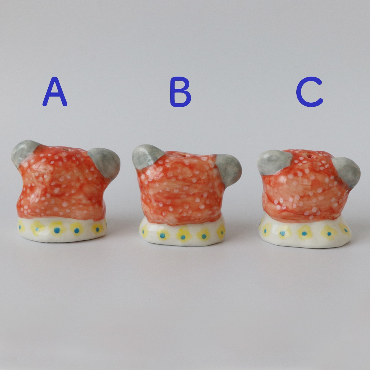 こちらの作品は、磁土(磁器)から形をつくり、陶芸用の絵の具で色付けをして、つやのある透明の釉薬をかけて焼成しました。