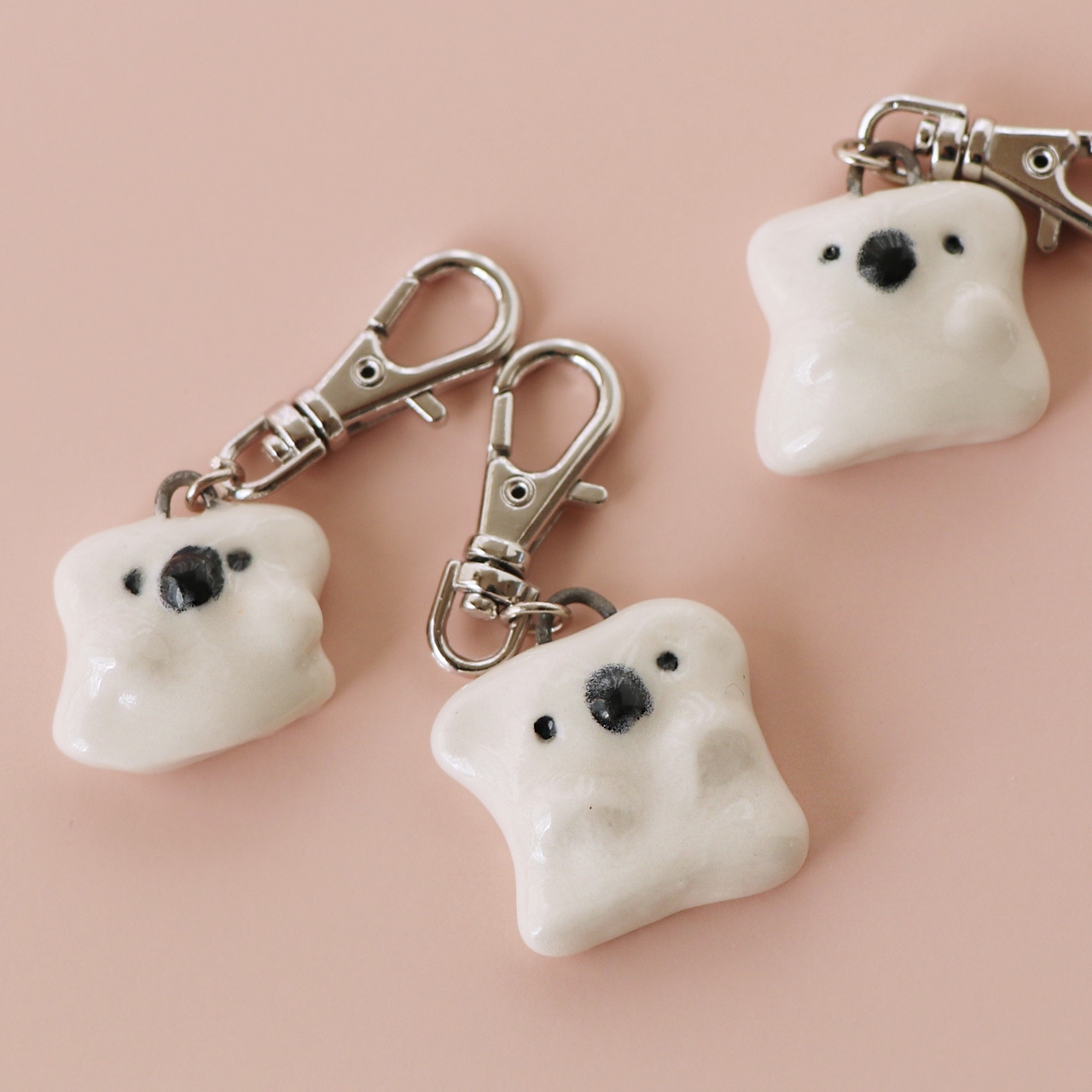 通常、釉薬を全体にかけての焼成はひと手間かかるため、一般的にはあまり行われません。こちらのキーホルダーは、時間をかけて一つずつ全体に釉がけを施しています。