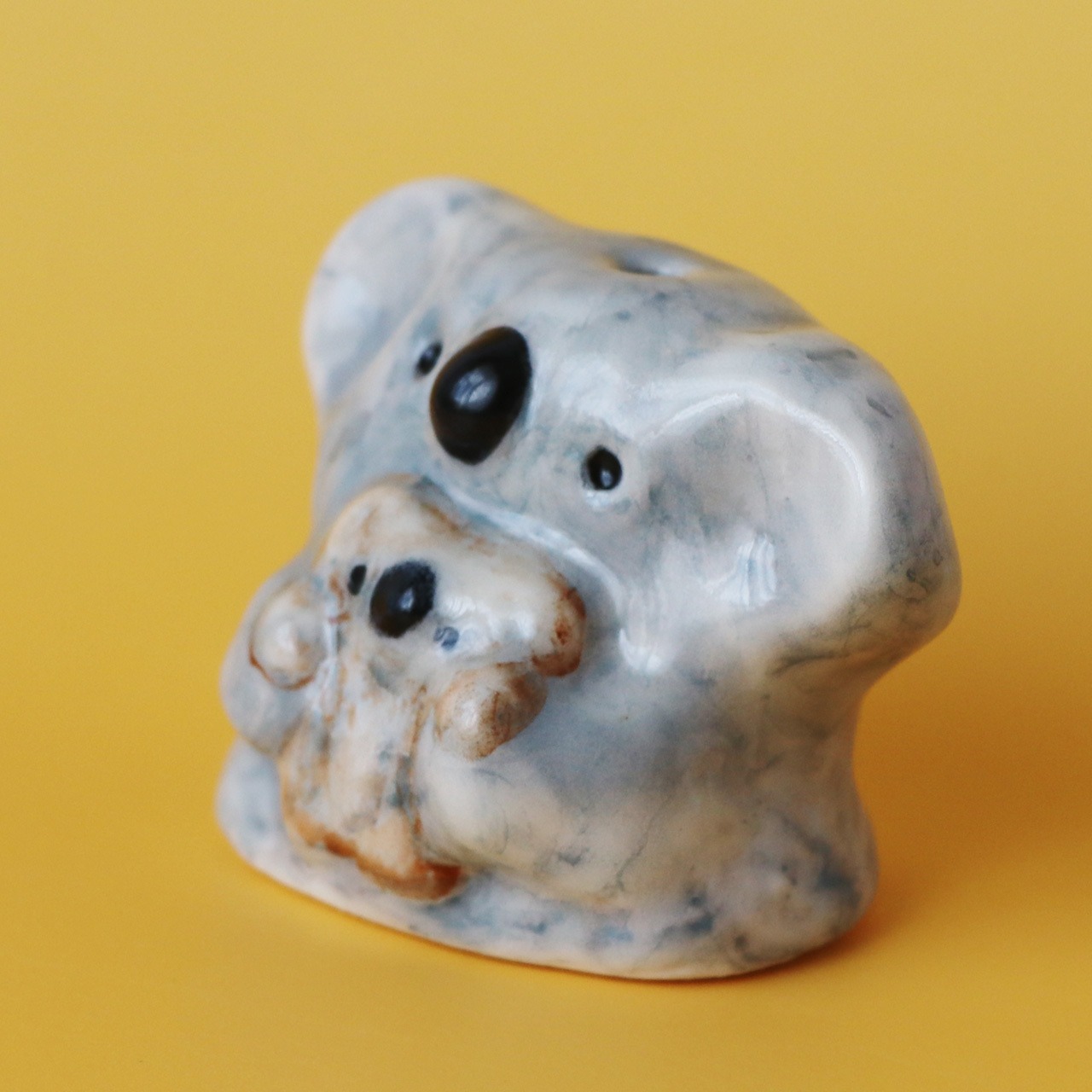 ママコアラが小さなベイビーコアラを抱っこする愛らしい花さしです。