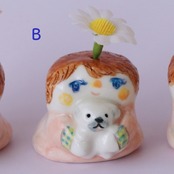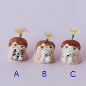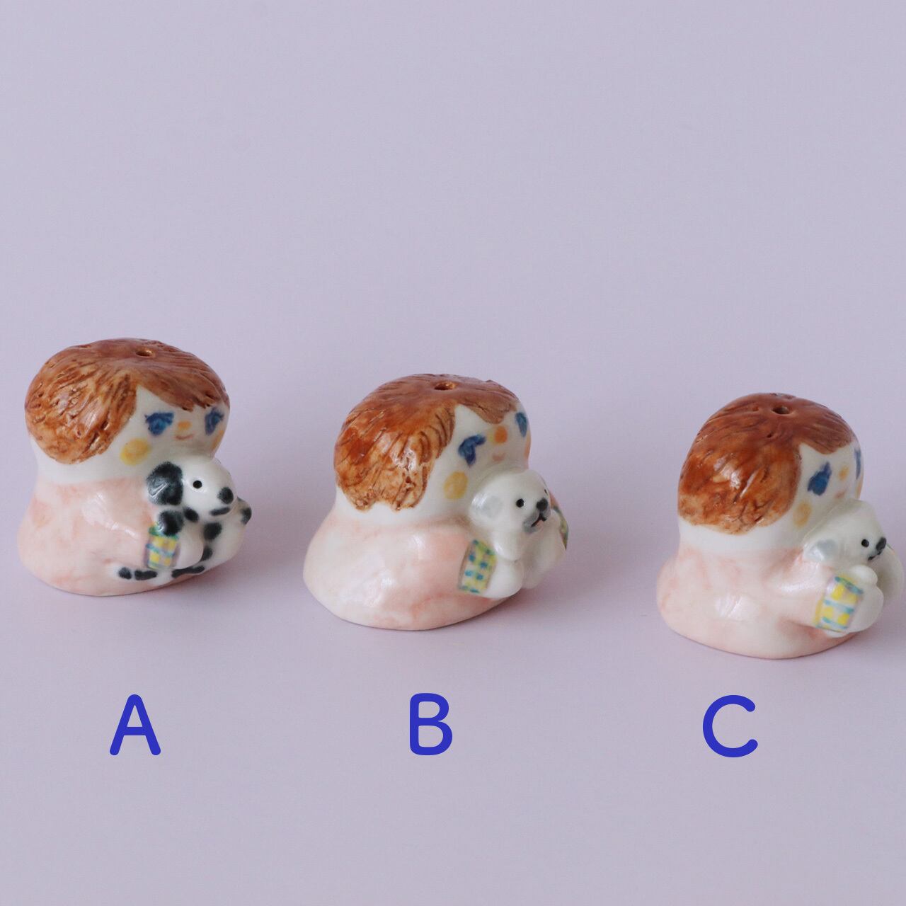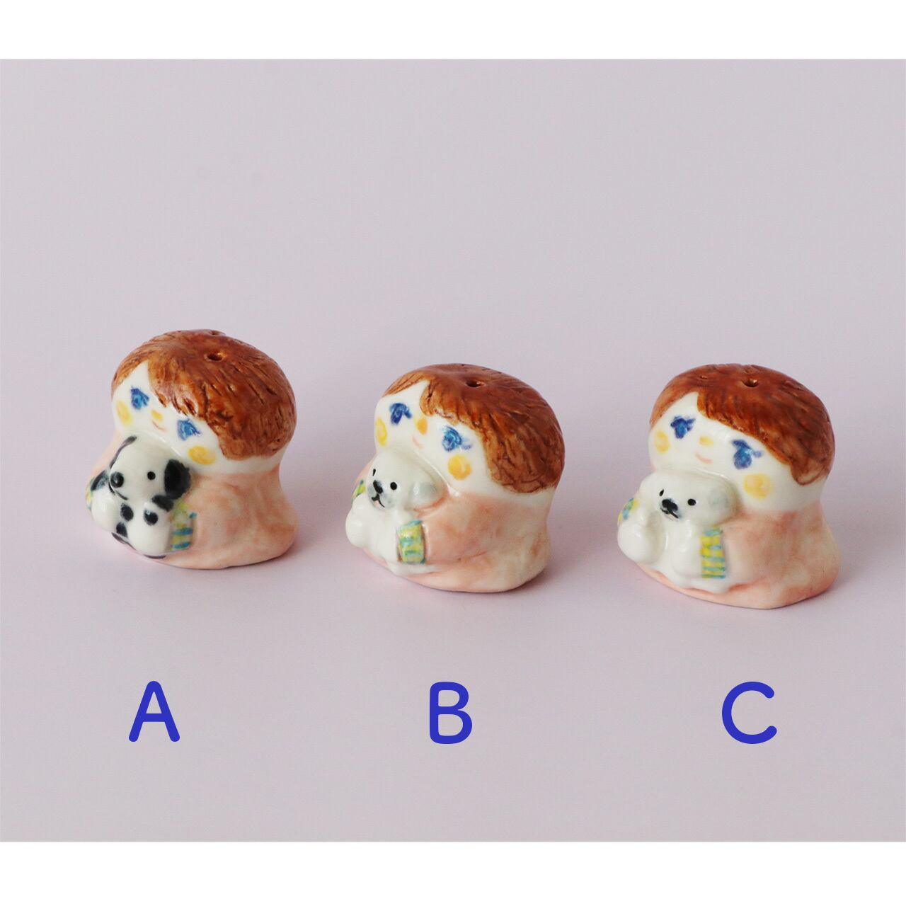 赤みのあるブラウンの髪色にピンクのワンピースを着た女の子が、黒ぶちのわんこと白い鼻ぺちゃ犬を抱っこした置物となります。