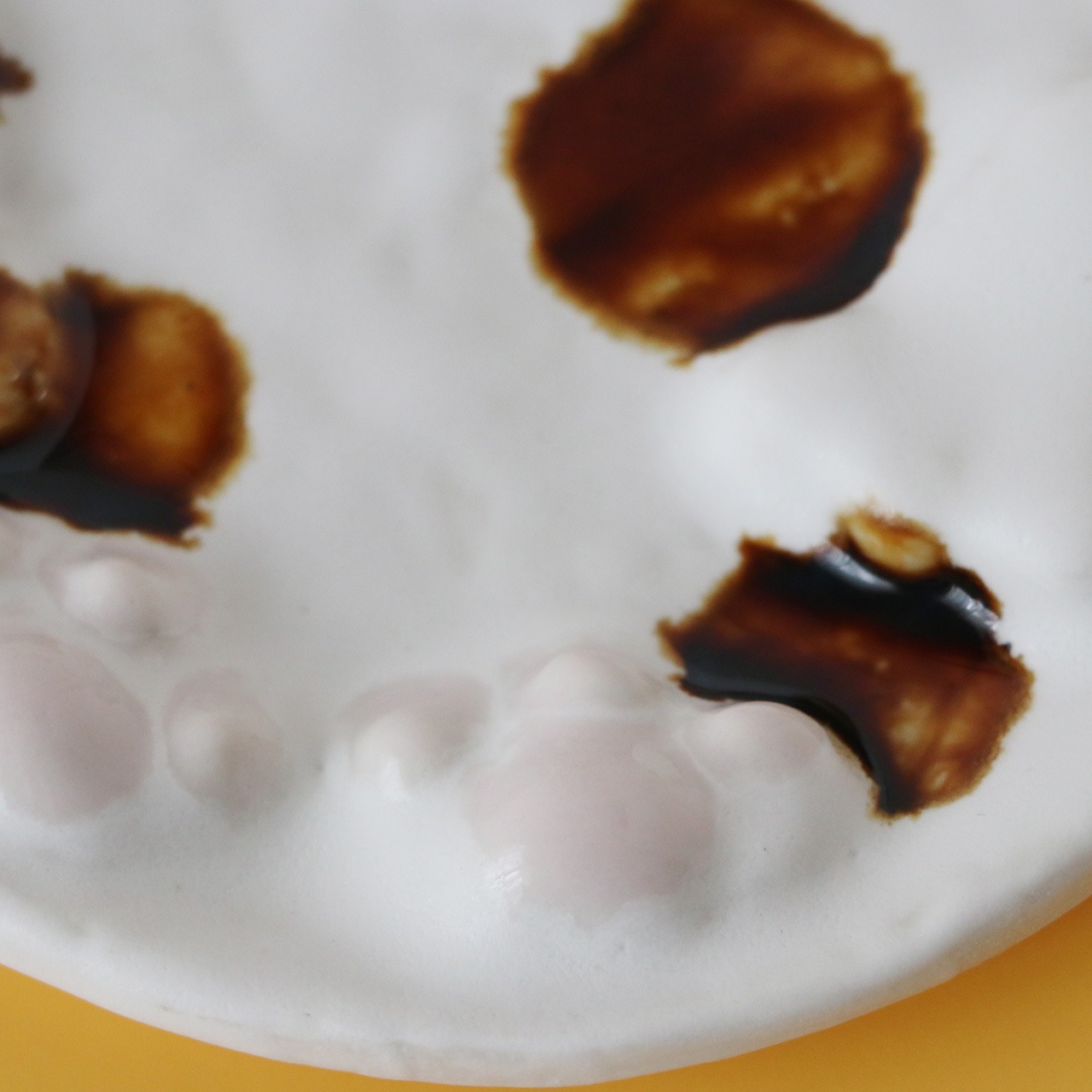 イチから手で制作しており、自然の素材から制作しているため、全く同じ素材を使用していても、絵の具や釉薬の塗りムラやにじみ・ピンホール(小さな穴)・黒点・釉薬の模様・気泡・焼き色など固体によって異なります。そこが陶芸の魅力でもあり、つくり手としても楽しいところです。