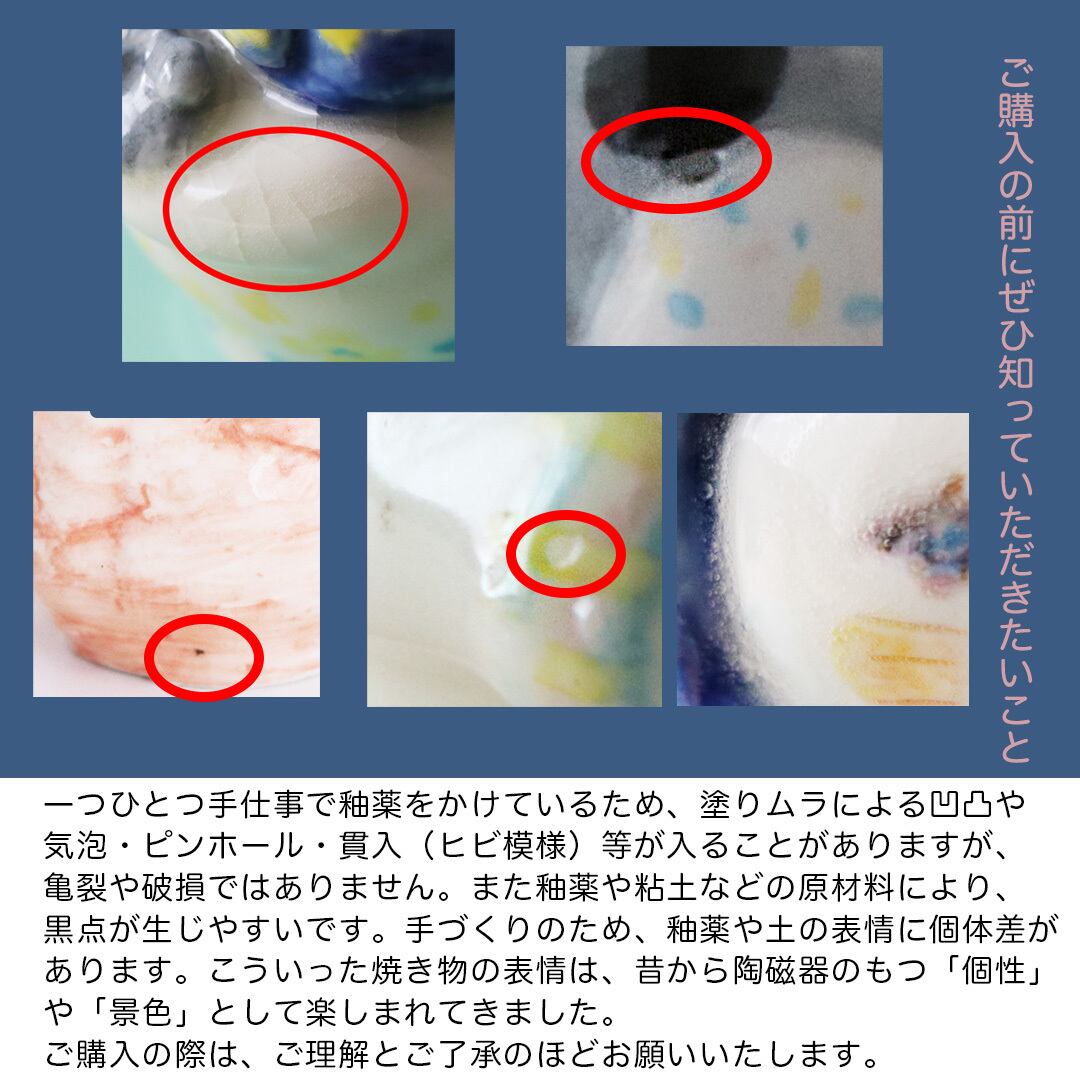 ・手作りかつ素材の特性上、気泡・焦げ・色ムラ・色剥げ・釉剥げ・黒点・ピンホール(小さな穴)など生じることがあります。
