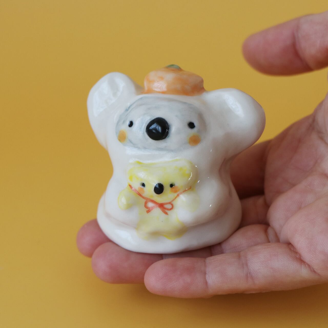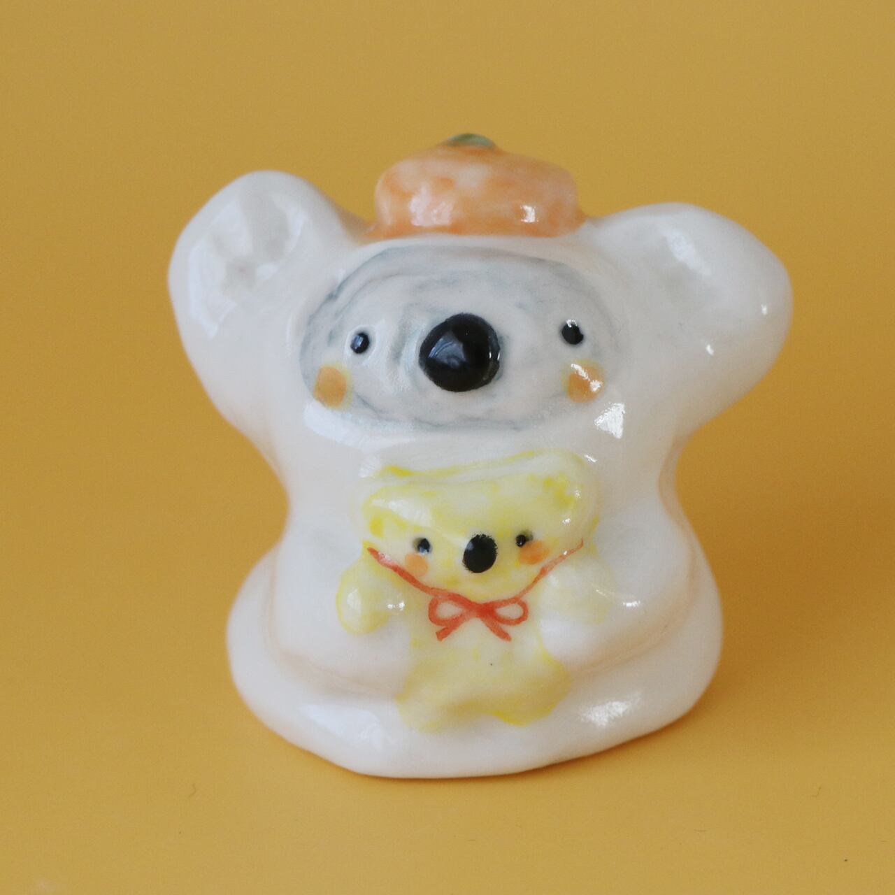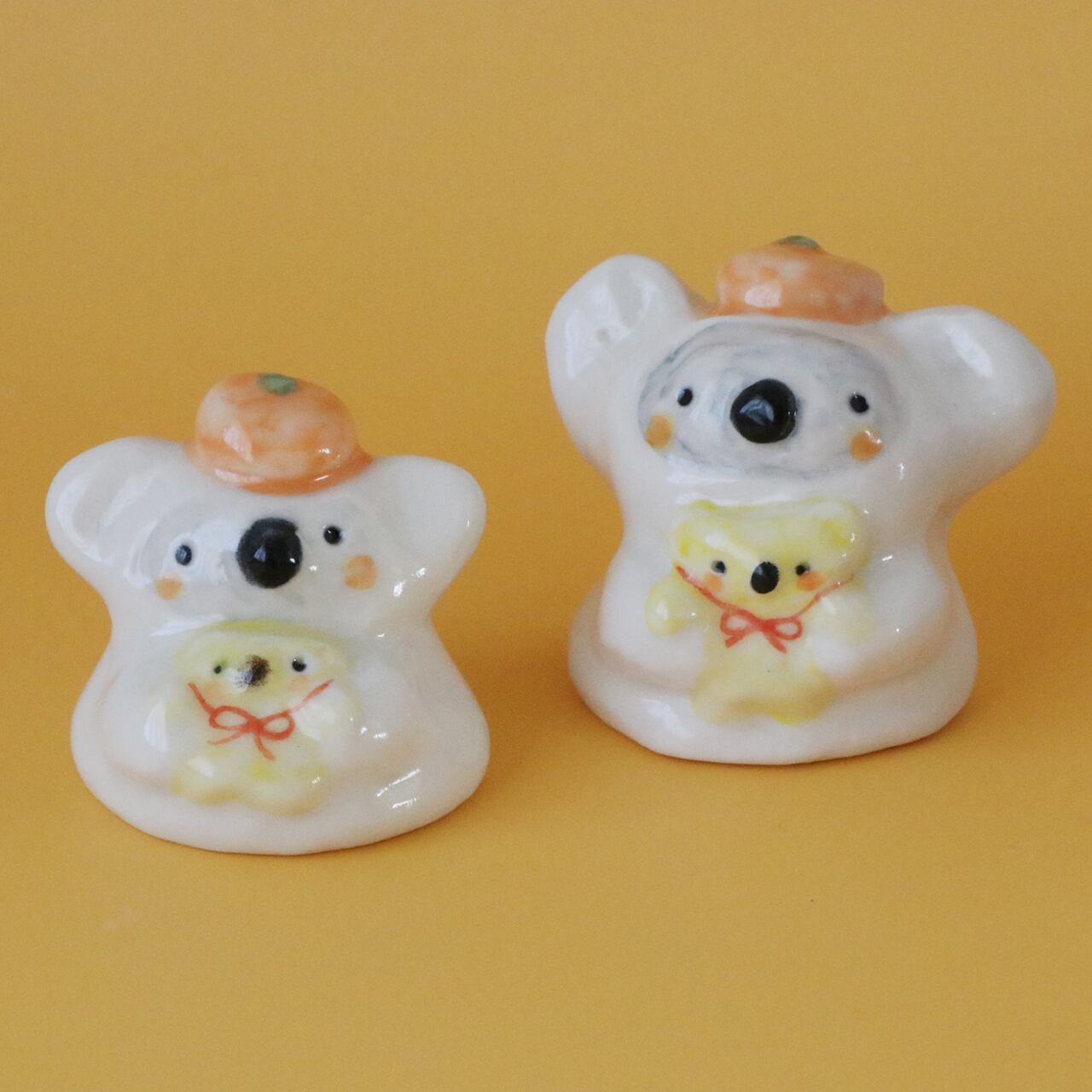 赤い蝶結びをつけてママに抱っこされた黄色のベイビーコアラ。