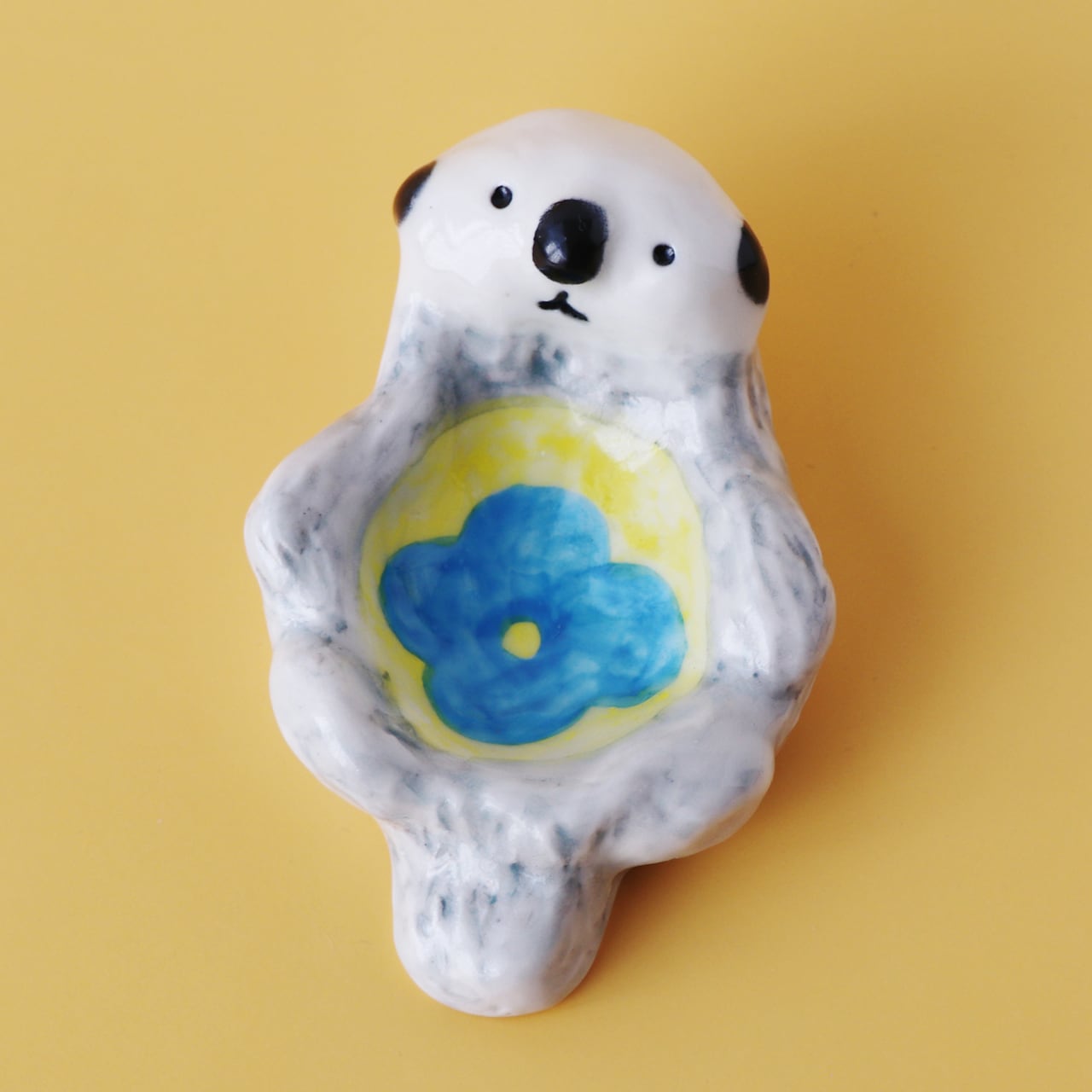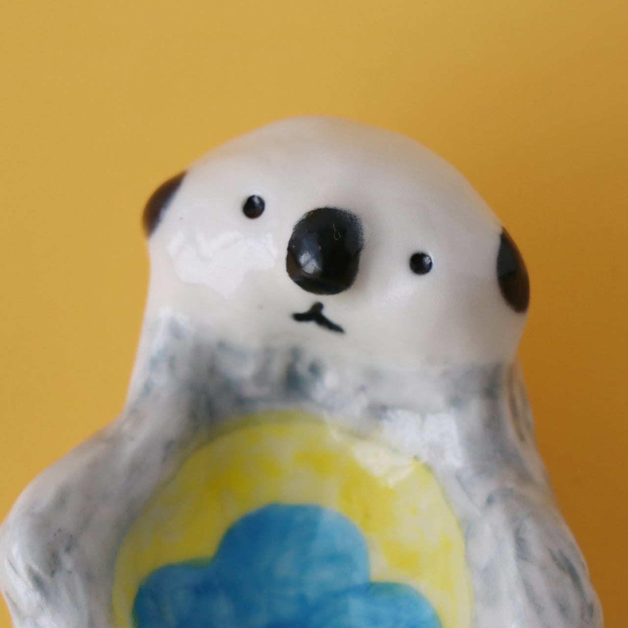 ラッコのグレーの毛並みやきょとんとしたかわいい表情、お腹のくぼみには花模様を描いて、ラッコの愛らしい見た目と雰囲気が伝わるように細部までこだわって制作しました。