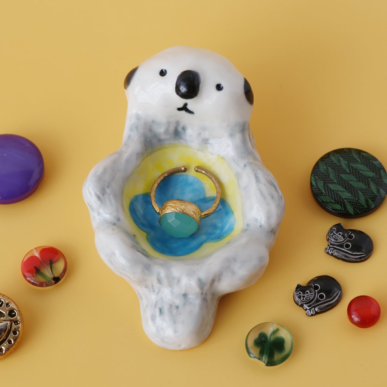 ラッコのお腹の小さなくぼみに指輪、ボタン、ビーズなどを入れてお部屋に飾ってお楽しみいただけます。